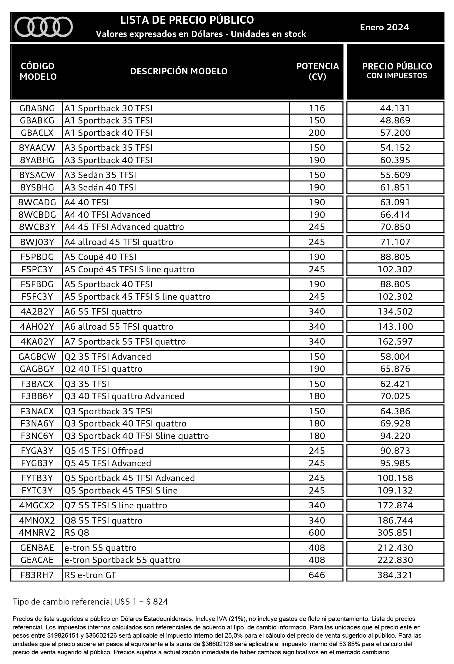 En materiales de la presente nota se adjunta lista de precios actualizada de la gama Audi.