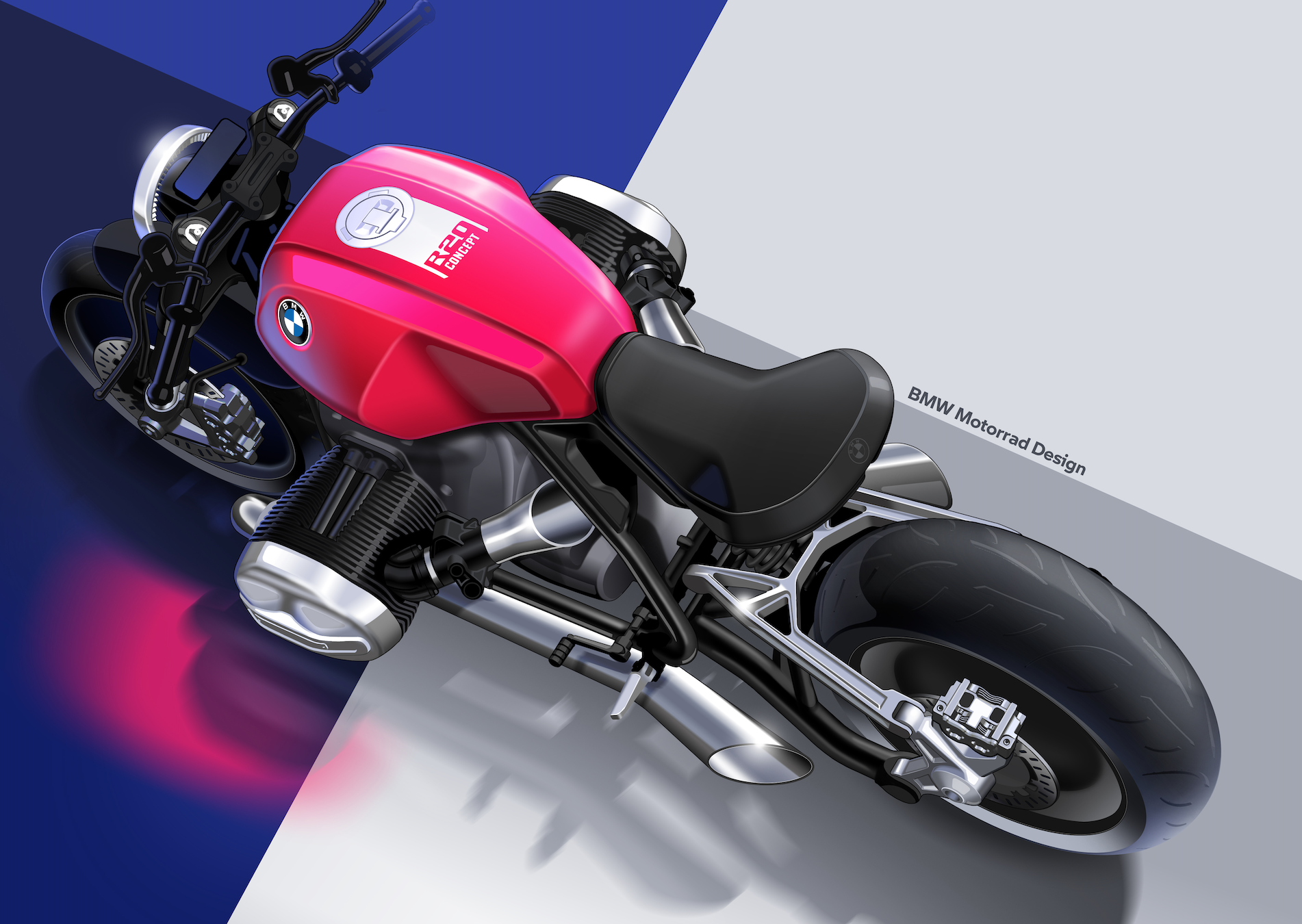 El tanque de combustible en aluminio recibió un nuevo diseño y se presenta en el color progresivo «más caliente que el rosa» de los años 70. El concepto BMW R20 está coordinado con el color de las tapas de cabeza del motor, la cubierta de la banda y las tomas de aire de admisión en aluminio pulido y anodizado, así como el brazo Paralever, el sistema de estribos y las mordazas de freno ISR en gris metalizado.