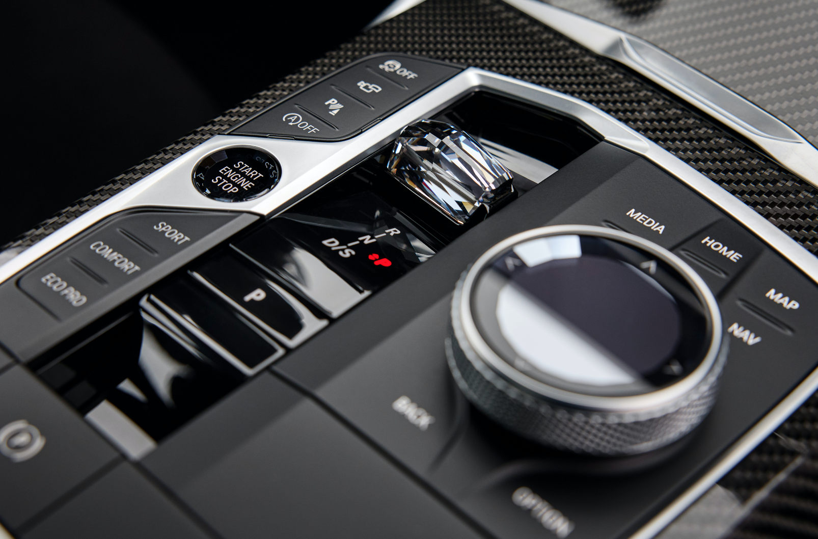 El uso de materiales de altísima calidad también permite incluir toques distintivos en otras áreas del interior para realzar su carácter premium moderno. Por ejemplo, los clientes ahora pueden especificar aplicaciones de vidrio CraftedClarity, otra nueva adición a la lista de opciones. Estas le dan a la palanca selectora de marchas, al controlador BMW iDrive y al botón de arranque/parada un aire particular de exclusividad, tanto visualmente como al tacto.
