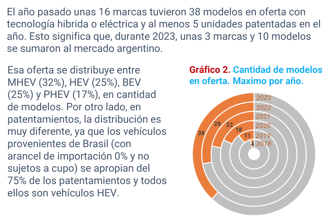 El Sistema de Información Online del Mercado Automotor de Argentina (SIOMAA) informa que en 2023 se patentaron en Argentina 9.601 vehículos híbridos y eléctricos. Predomina la tecnología HEV (85%) pero en 2023 creció sensiblemente la oferta de vehículos híbridos MHEV y se consolidó el mercado de eléctricos puros pequeños, urbanos y simples.