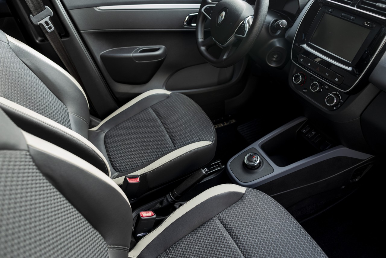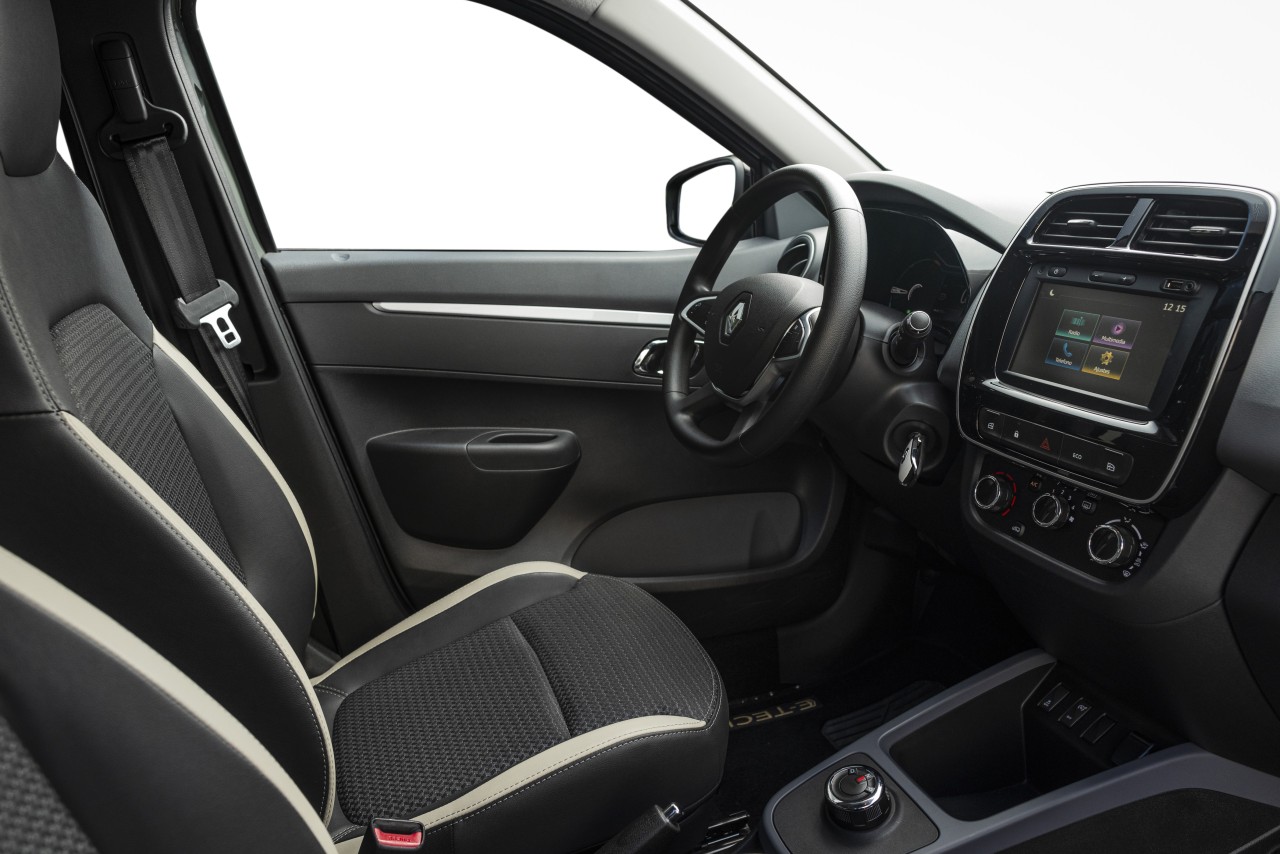 Con un tablero de bordo con detalles plateados combinados con negro brillante, el habitáculo del Kwid E-Tech 100% eléctrico es funcional. La palanca de cambios se sustituye por un mando giratorio cromado, que es fácil de usar en tres posiciones: D (marcha hacia adelante), N (neutral) y R (marcha atrás).