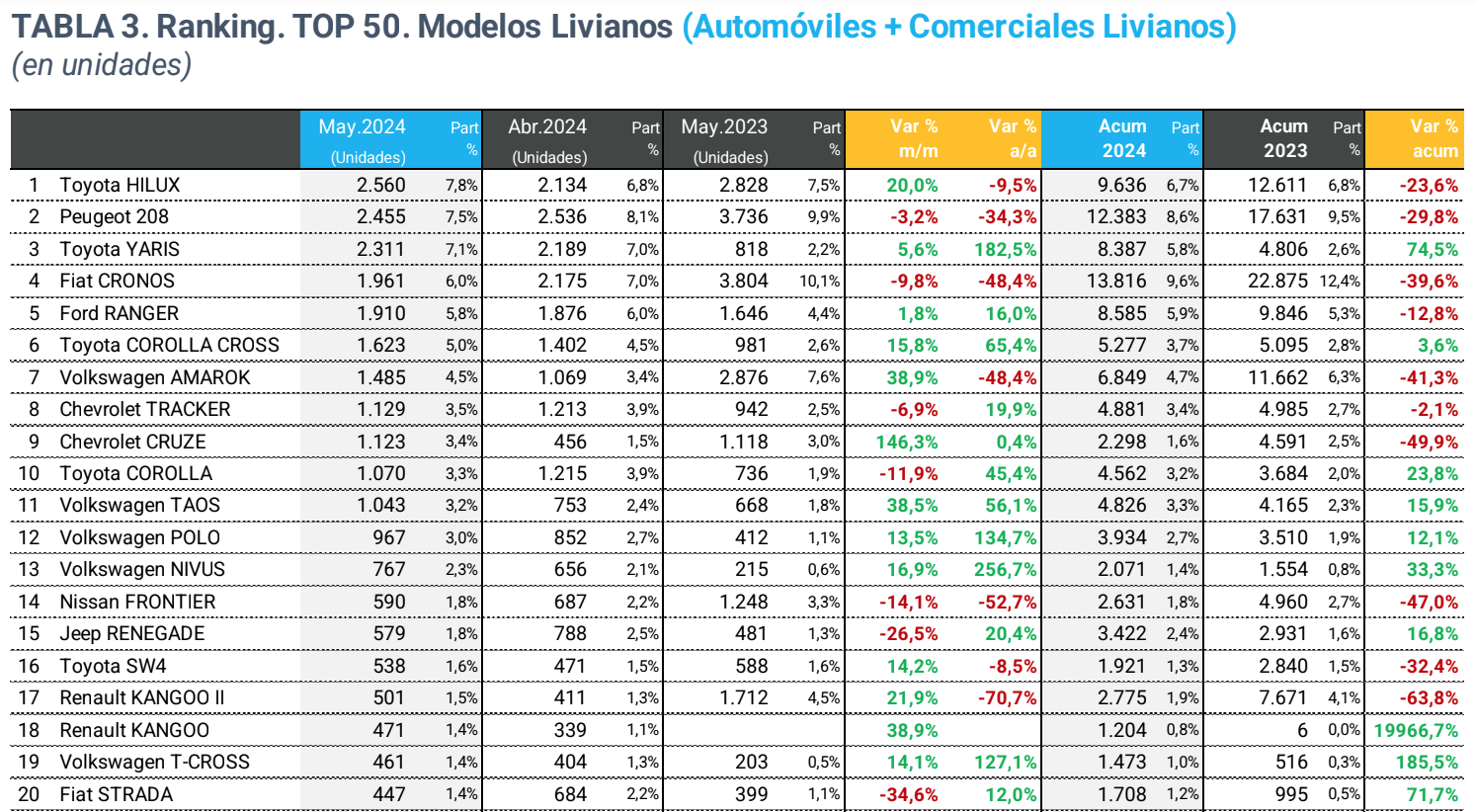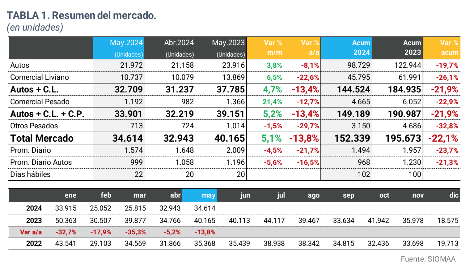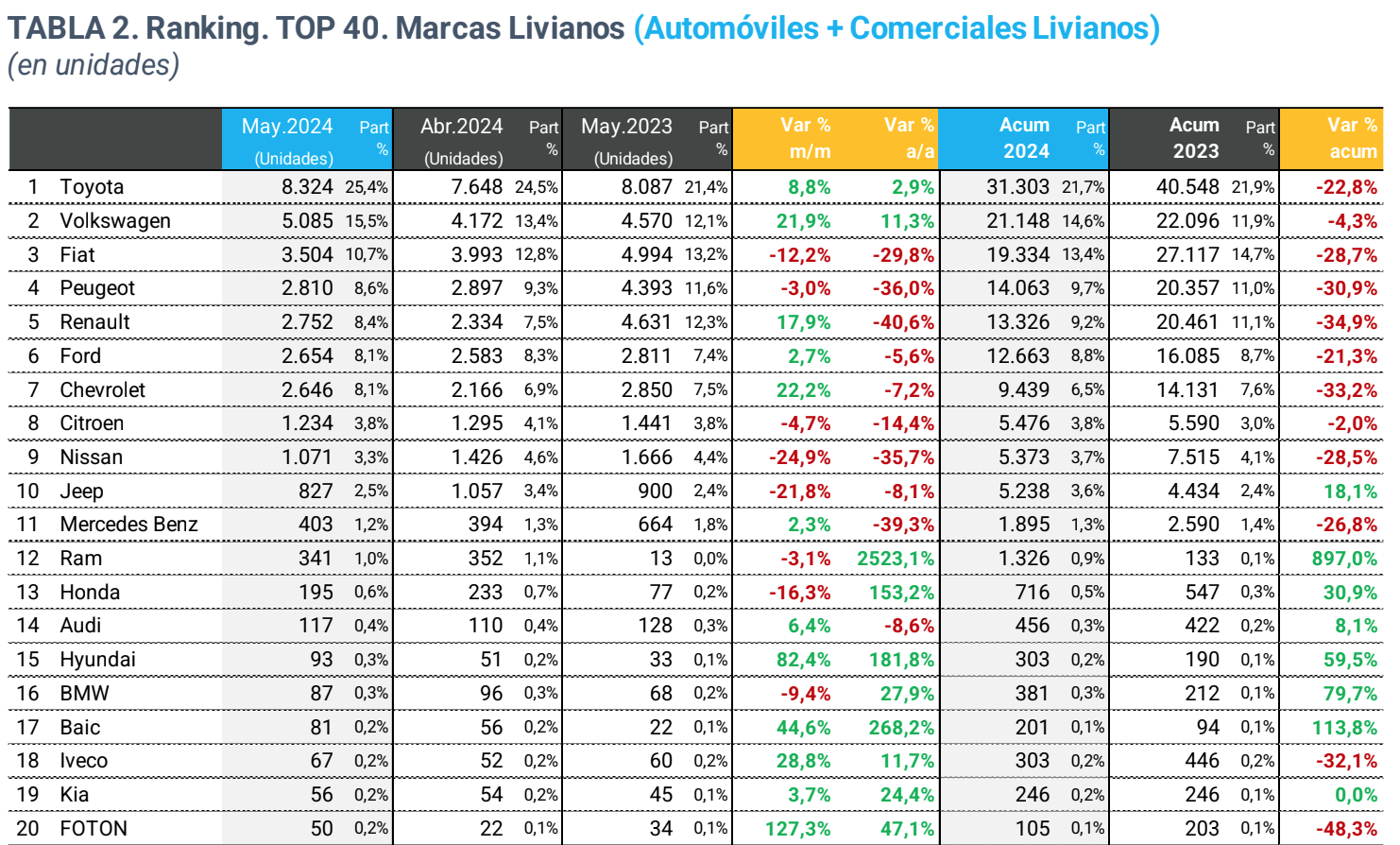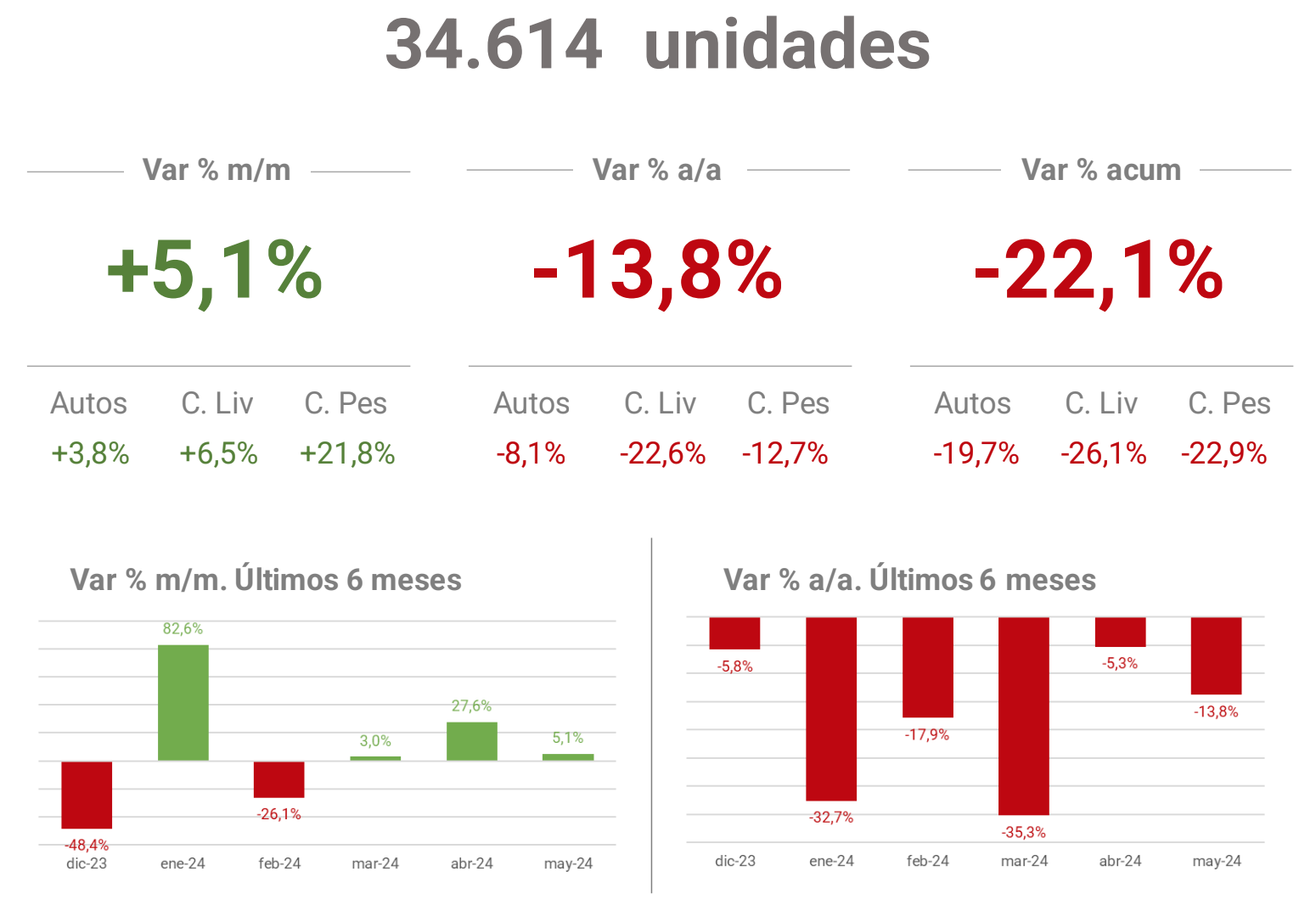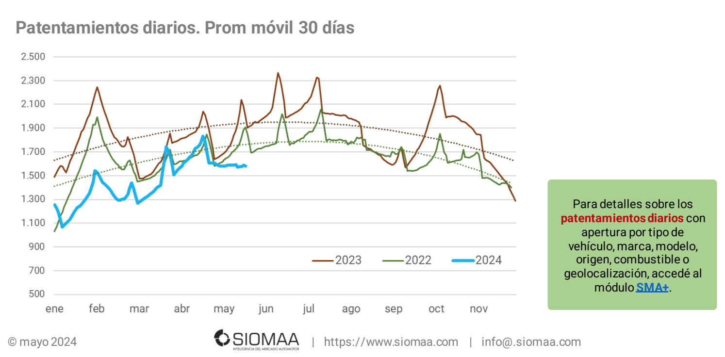 La Asociación de Concesionarios de Automotores de la República Argentina (ACARA) informa que el número de vehículos patentados durante mayo de 2024 ascendió a 34.614 unidades, lo que representa una baja del 13,8% interanual, ya que en mayo de 2023 se habían registrado 40.165 unidades. Si la comparación es con abril de este año, se observa una suba del 5,1% ya que en el pasado mes se habían registrado 32.943 unidades.